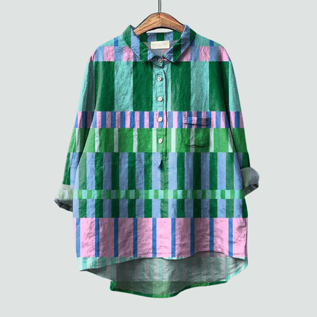 This button-up blouse delivers a striking geometric punch with its playful patchwork of stripes and blocks—all while keeping you cool in a soft linen-cotton blend. The structured collar and pocket detail bring just the right amount of polish to its vibrant personality.